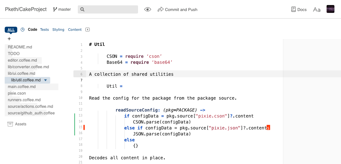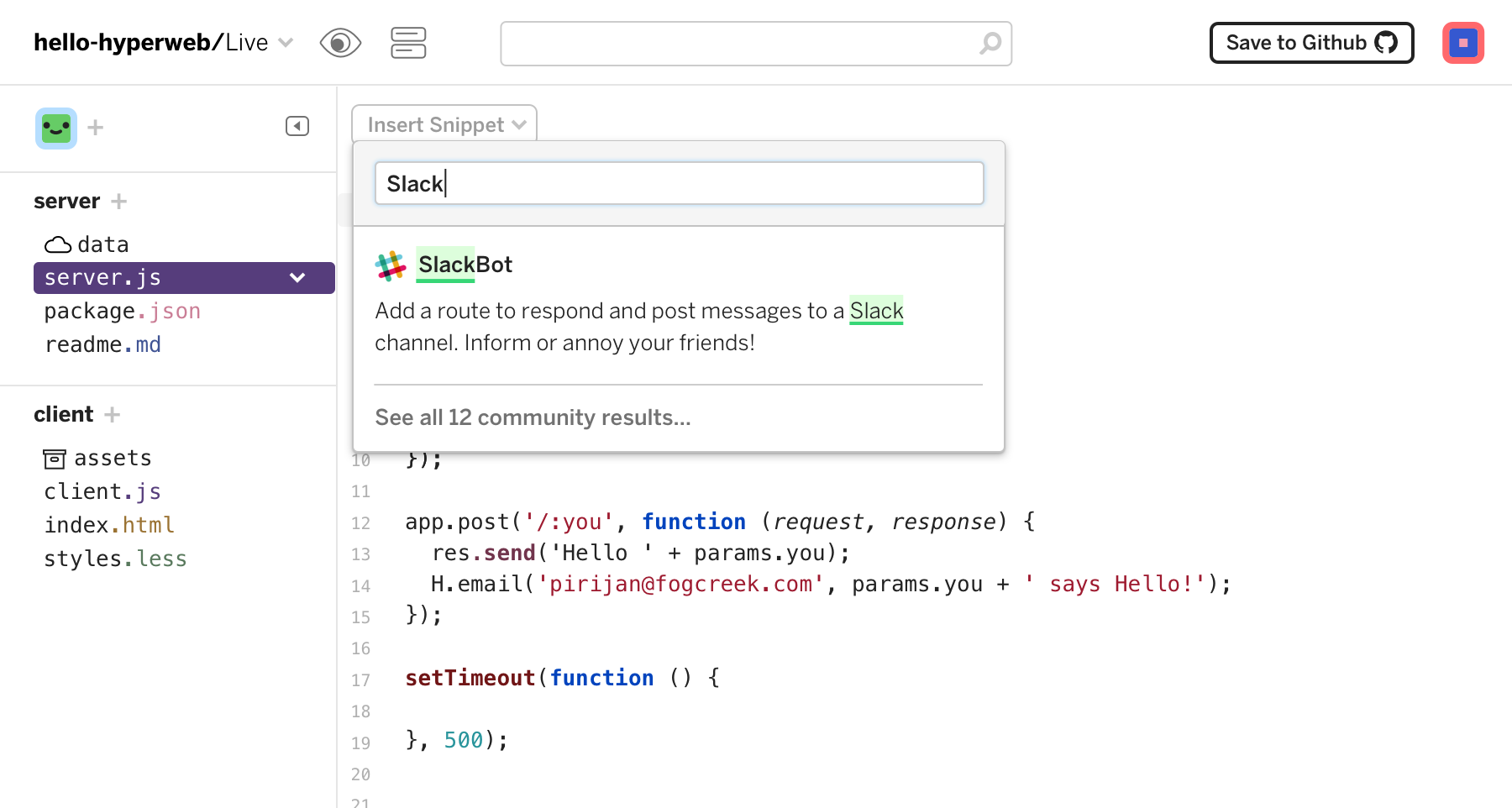 To make it easier to do common coding tasks, I wrote a feature that would let you search and insert pre-made code snippets into your document to do things like init a Slack bot in a js file or scaffold an animation with keyframes in some css.
