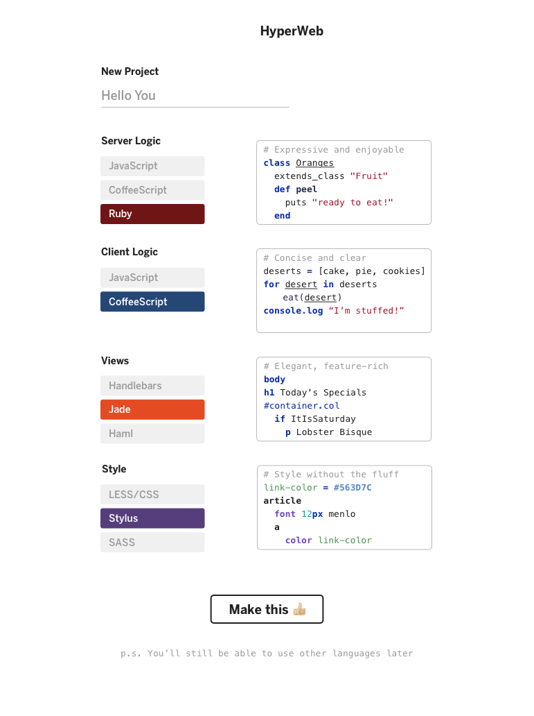 Additionally, going from something like js to coffee was easy, but what about from coffee to python? How would hyperweb-init work in other languages that might not have existing libs for server-side compilation of coffee or less? If I changed server.js to swift, what impacts does/should that have on package management?