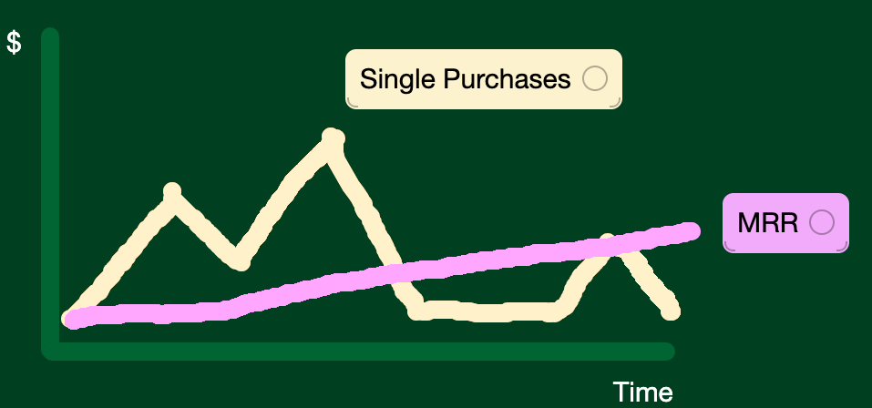 Especially for solo creators, just knowing that you have ~$3000/mo coming in every month is way less anxiety-inducing than making $6,000 in a good month – but knowing that next month you could just as likely make $1000, or maybe even $0. It’s like being a farmer, surviving at the mercy of good weather.